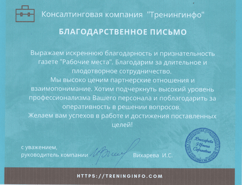 Благодарим газету Рабочие места и особенно нашего персонального ведущего менеджера за плодотворную работу в рамках организации и реализации размещения наших вакансий. Хочется отметить точное выполнение взятых на себя обязательств, творческий подход к решению каждой задачи. Нам очень нравится работать с вами, нравится удобный сервис вашего агентства и внимание к деталям. Надеемся на взаимовыгодное сотрудничество в будущем.