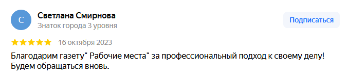Хотим выразить искреннюю благодарность изданию газеты "Рабочие места" за высокий уровень сервиса и надлежащее качество работы, а также поставить высокую оценку менеджеру Ефремовой Надежде за профессиональный подход, консультации и решение спорных вопросов по размещению рекламы на Ваших страницах. Всегда активная, веселая и доброжелательная, приятно работать.