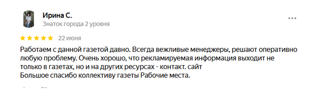 Минимум забот и проблем» - вот как я могу охарактеризовать работу с газетой «Рабочие места». Несмотря на то, что находимся мы в разных часовых поясах – темп работы не замедляется, менеджеры оперативно реагируют на поступающую информацию и также оперативно дают ответ!